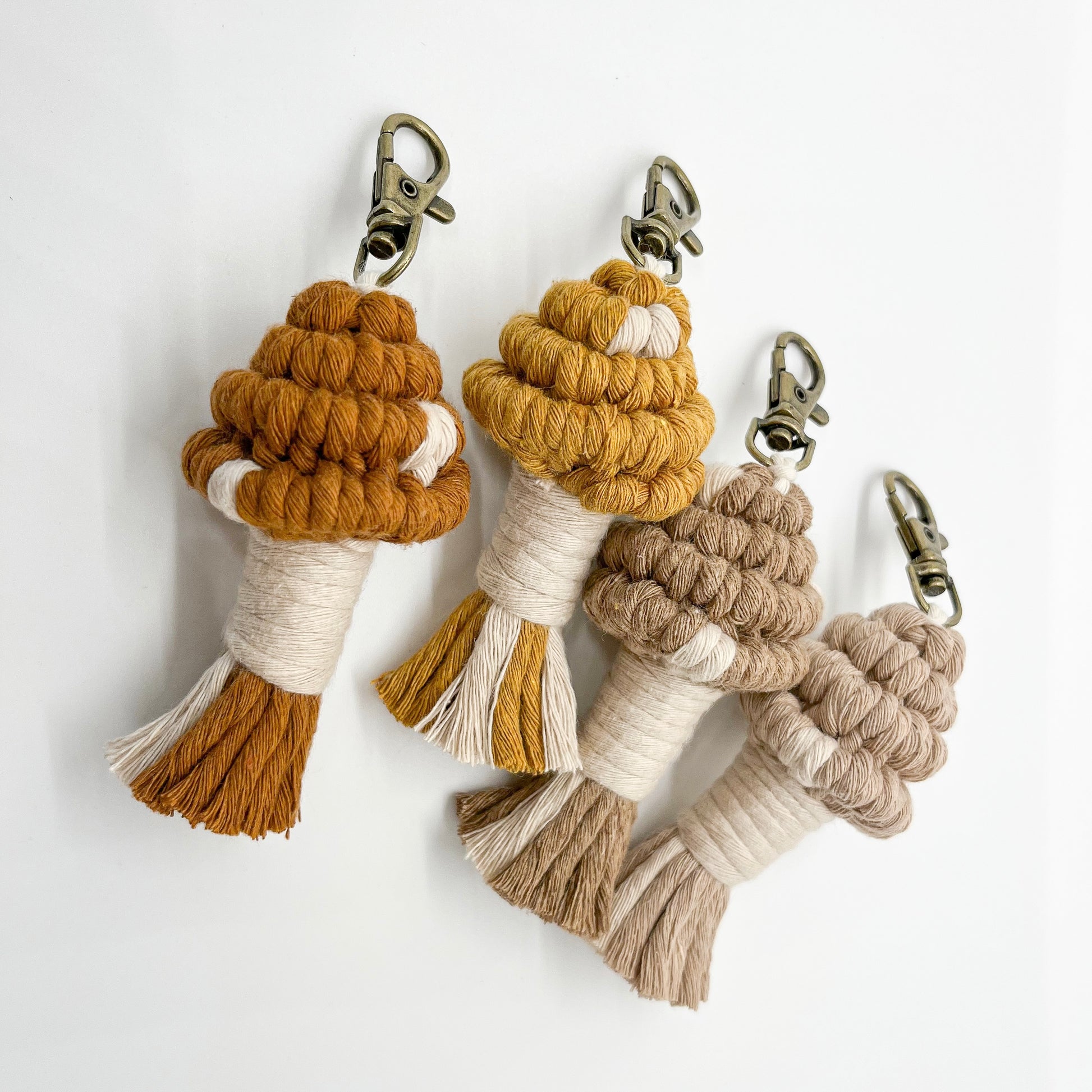 Each keychain measures approximately 4.5 inches long (from top of keyring clasp to bottom of mushie) and 2 inch wide (give or take). Keyring clasps are 360 degree rotating!