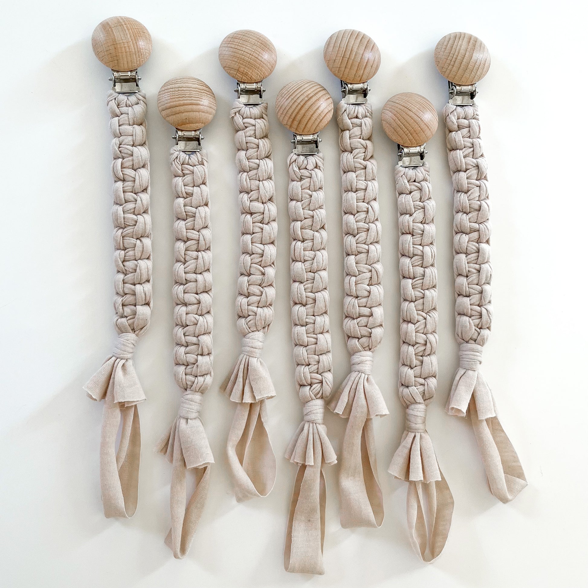 Our pacifier clips are made with T-shirt yarn, which allows for flexibility when baby is using the pacifier. The neutral color and style will match any outfit!
